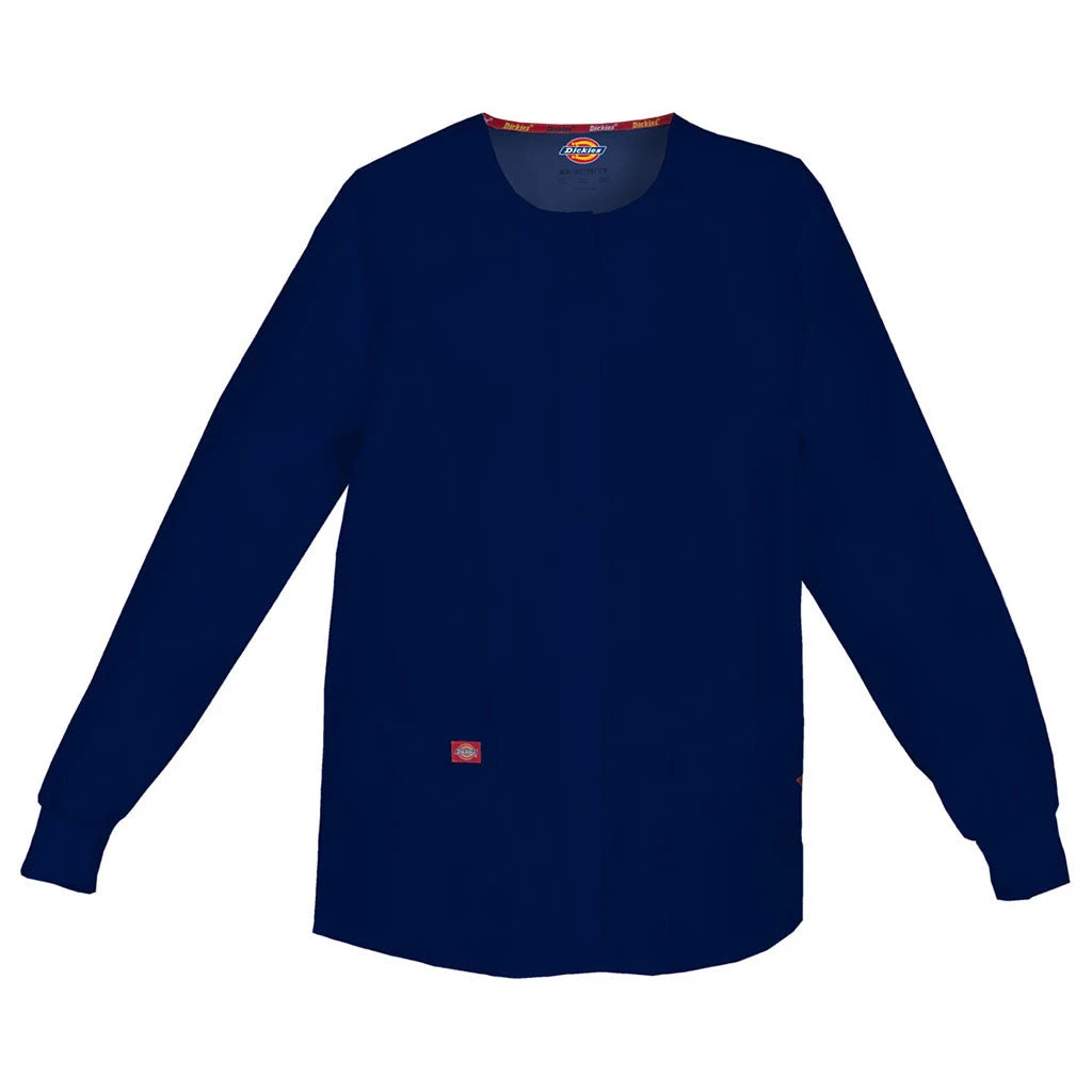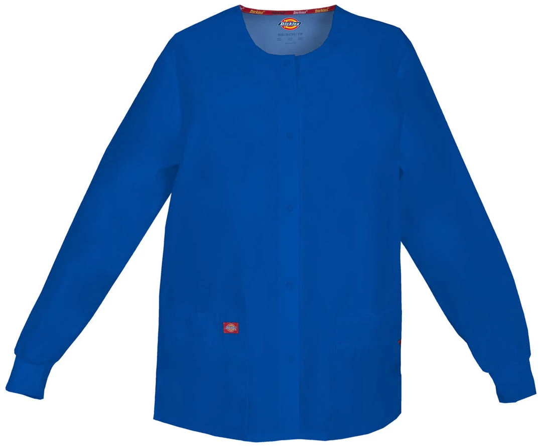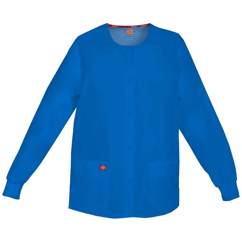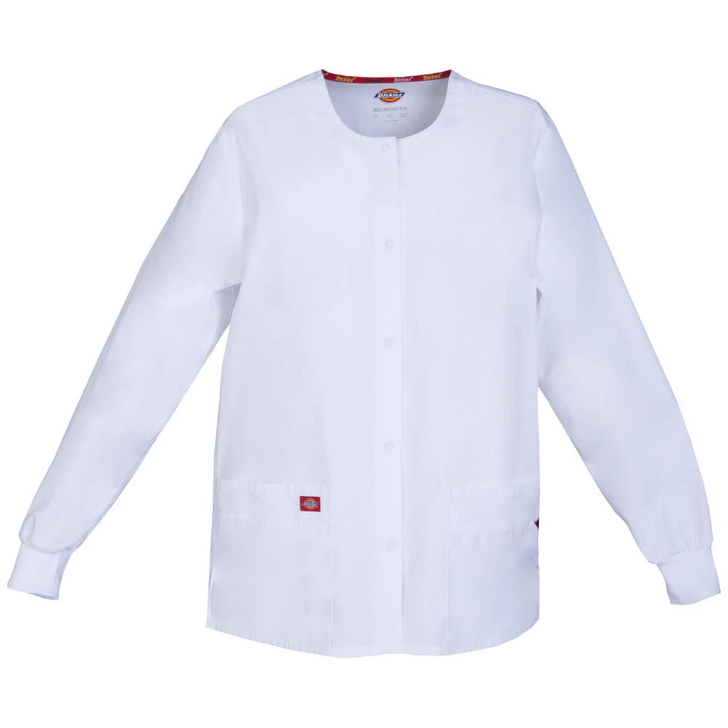 Missy fit, round neck, snap front, warm-up jacket features Dickies logo twill tape at the back neck and an instrument loop on the left pocket. Also featured are knit cuffs, multiple patch pockets, a stretchy Red knit interior pocket (White knit pocket on White), a back yoke and side vents. Center back length: 28.5″.