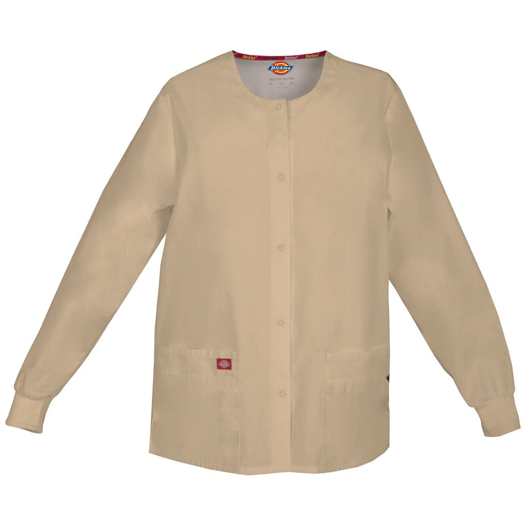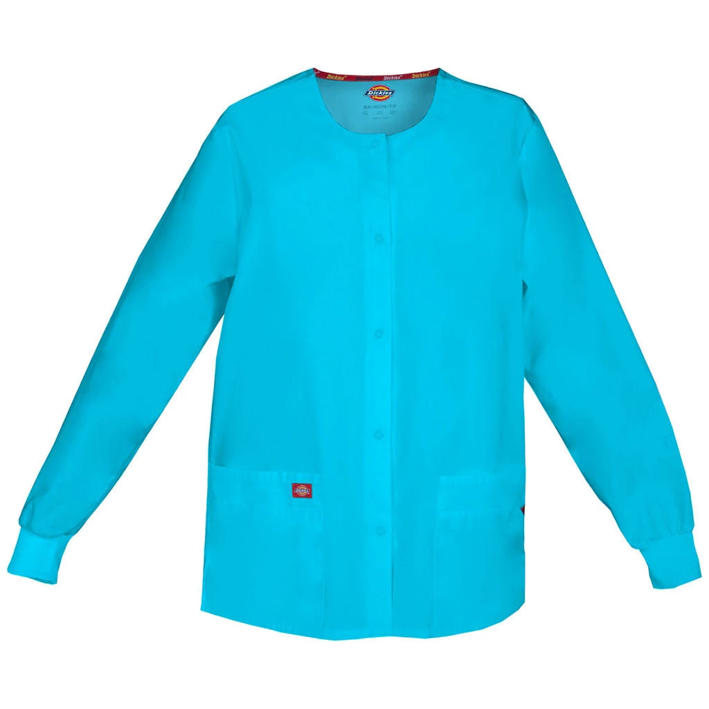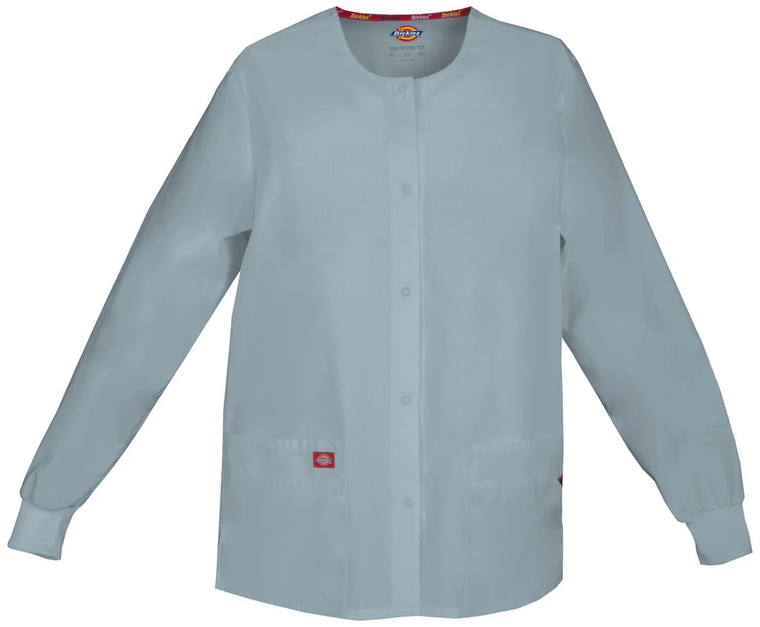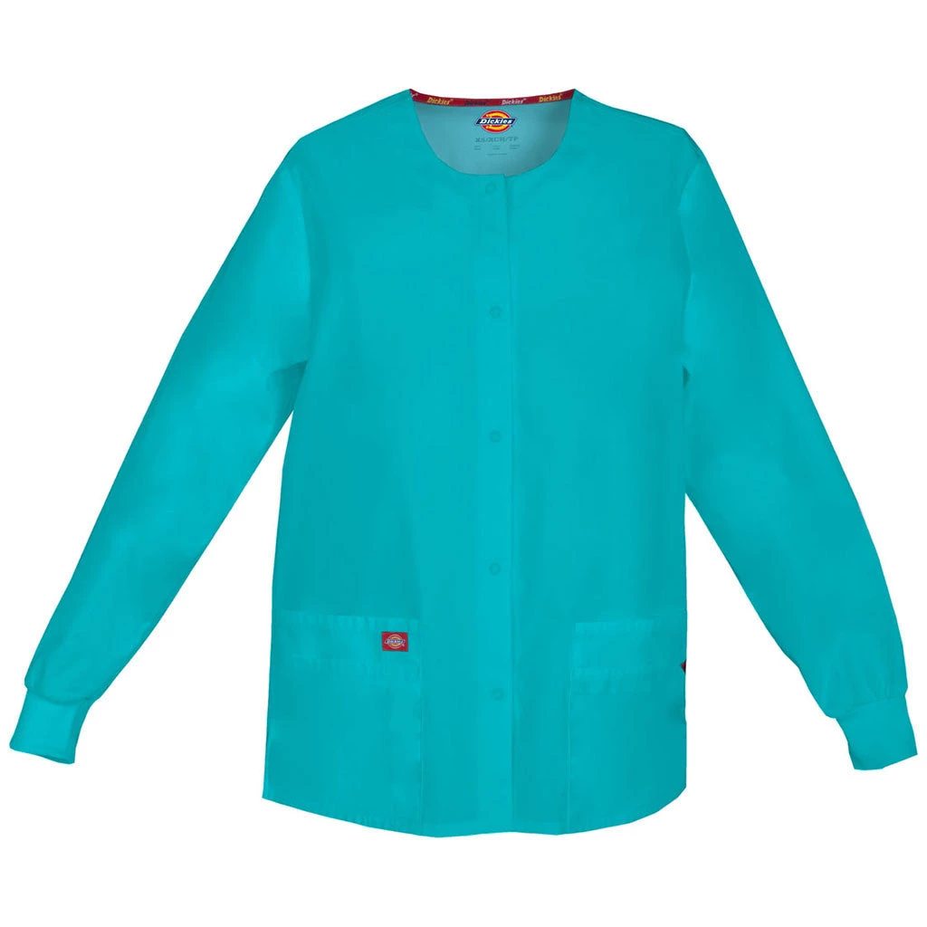 Missy fit, round neck, snap front, warm-up jacket features Dickies logo twill tape at the back neck and an instrument loop on the left pocket. Also featured are knit cuffs, multiple patch pockets, a stretchy Red knit interior pocket (White knit pocket on White), a back yoke and side vents. Center back length: 28.5″.