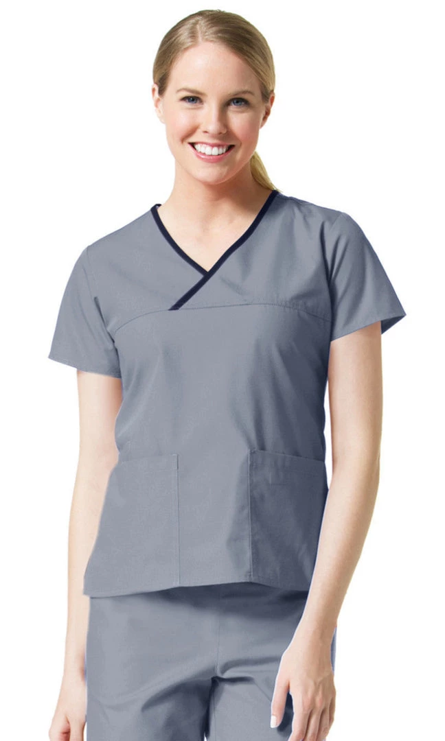 - Mock wrap top with contrast detailing